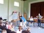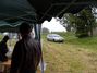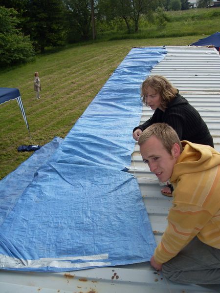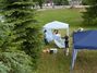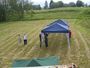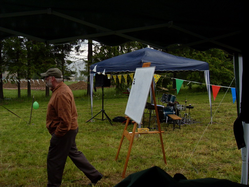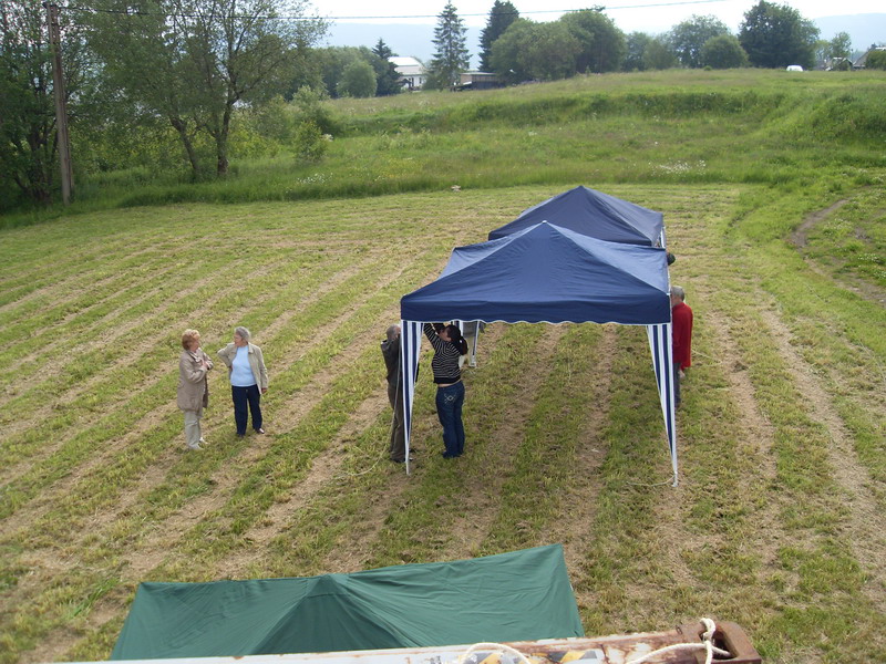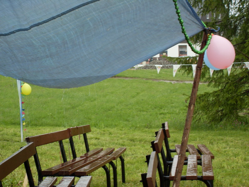Gemeinschaftsgrundstück geplant. Das Wetter hatte nicht seinen stabilsten Charakter. Regenschauer waren nicht auszuschließen. Doch der Himmel riss auf und die Sonne zeigte sich. Wir schickten mehrere Stoßgebete zu Gott und bauten Pavillions, Bänke und - ganz neu - eine Plane als Überdachung auf.