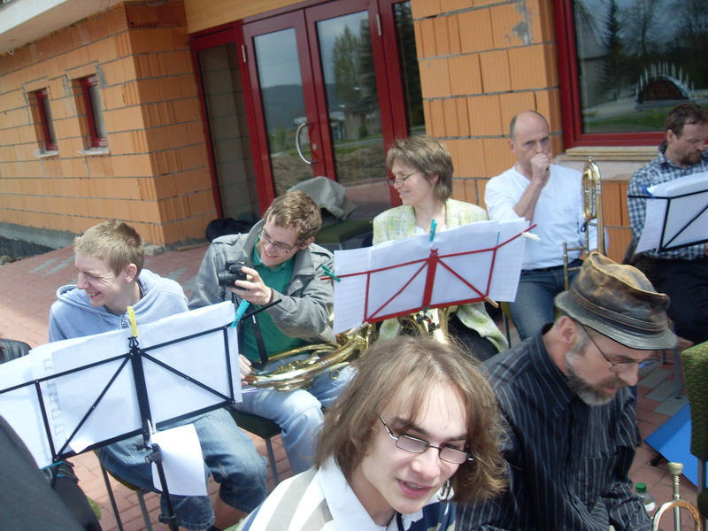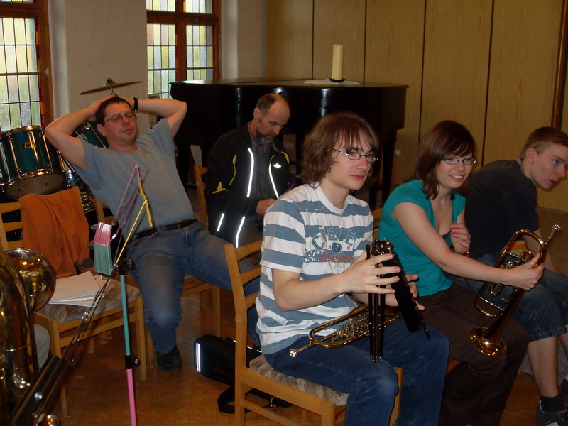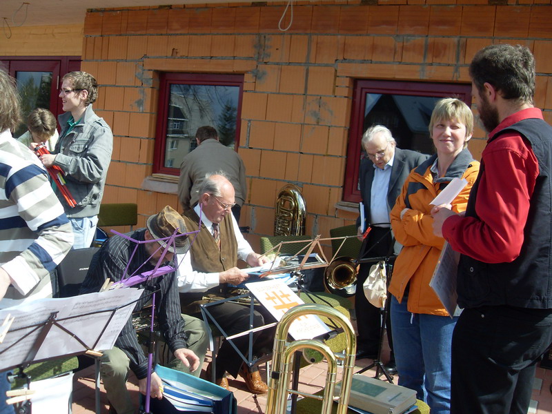 Wie schon letztes Jahr hat der Posaunenchor die Ausgestaltung unserer Pfingststunde übernommen. Für die Leitung unseres Posaunenchores und die Predigt konnten wir Stephan Hoffmann, unsen sächsischen Landesposaunenwart gewinnen. An drei Probeabenden mühte sich Stephan Hoffmann, um die geplanten Vortragsstück mit uns einstudieren. Als kleine Motivation wurde an die letzte Probe eine kleine "Grillfete" angeschlossen.