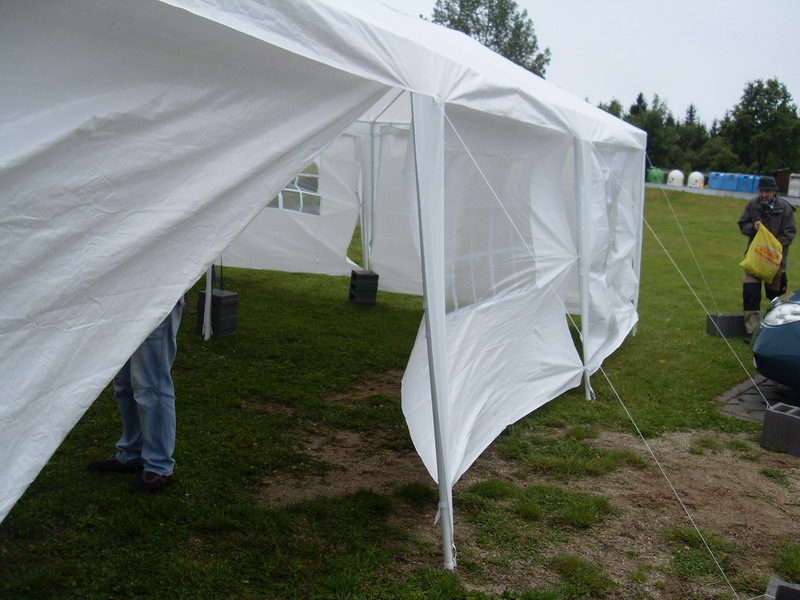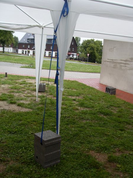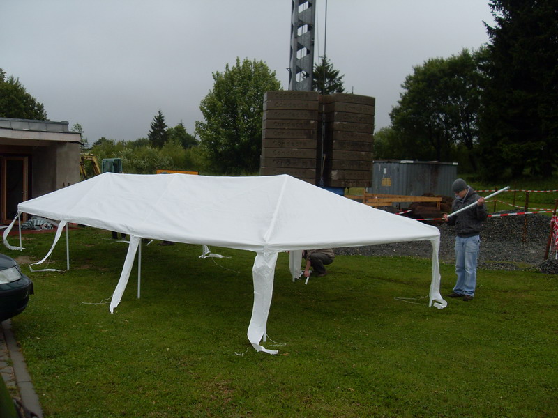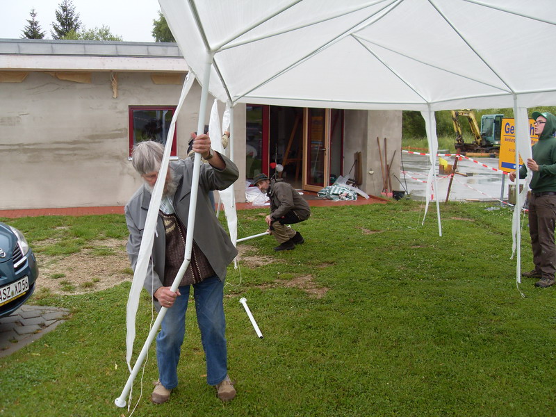 Bereits der Aufbau des Zeltes war nicht von Ungefähr. Manche Sturmböe drückte das Zelt zu Boden oder wollte es in die Luft erheben. Es gab aber genug Baumaterial, da der 2. Bauabschnitt begonnen hat, und so mussten schwere Betonsteine das Zelt sichern.