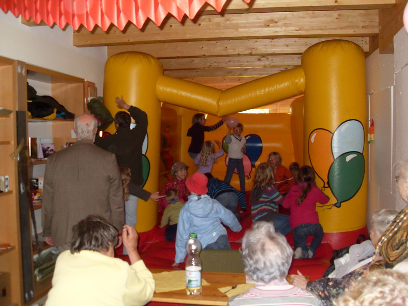 Tatsächlich passte die Hüpfburg in Breite und Höhe genau in das Foyer. Und die Kinder nutzten die Möglichkeit nach Kräften.