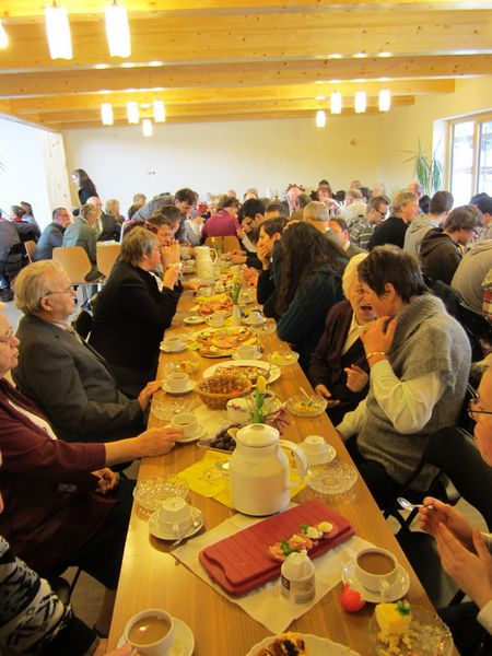 Gemeinschaftshaus in der Schwefelwerkstraße 1 sein. Noch eines war in diesem Jahr neu - Unser Osterfrühstück im Anschluss nahmen wir in den Räumen des Gemeinschaftshauses ein. Die über 80 eingedeckten Plätze waren alle besetzt und jung und alt saßen gemeinsam beim Osterfrühstück.