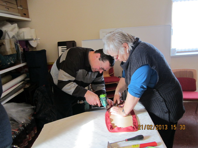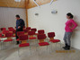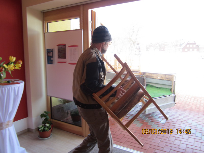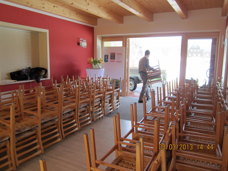 Dagegen erlebt unsere neue Bestuhlung ihren "zweiten Frühling". Sehr preisgünstig konnten wir Stapelstühle erwerben, die schon mehrere Jahre ihren Dienst in einer anderen Gemeinde taten. Viele fleißige Helfer haben diesen Stühlen ein neues Aussehen gegeben und neu gepolstert - in einem "freundlichem" rot.