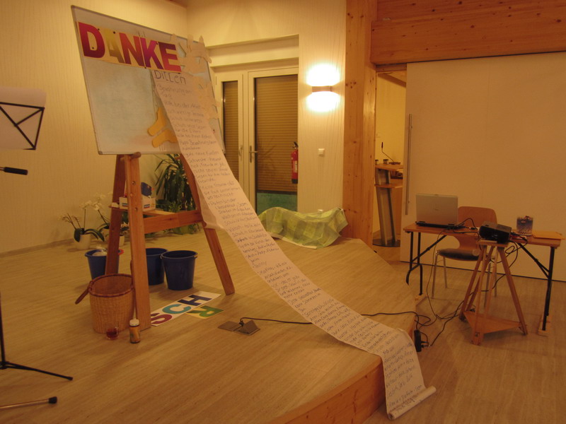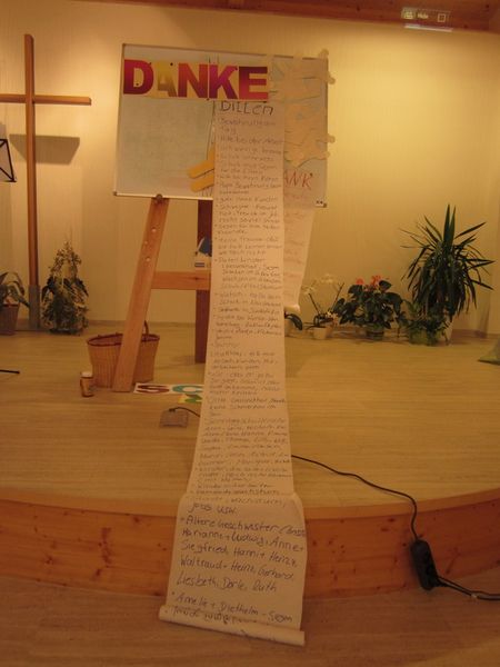 Das Wort "DANKE" musste von den Anwesenden erraten werden. Dabei kam zwischenzeitlich auch das Wort "ANKER" zum Vorschein. Im Zusammenhang mit dem Wort "Anker" fragte Irmela unseren Gemeinschaftsleiter, ob er etwas dagegen hätte das Gemeinschaftshaus zu fluten, um einen Anker nutzen zu können.
