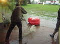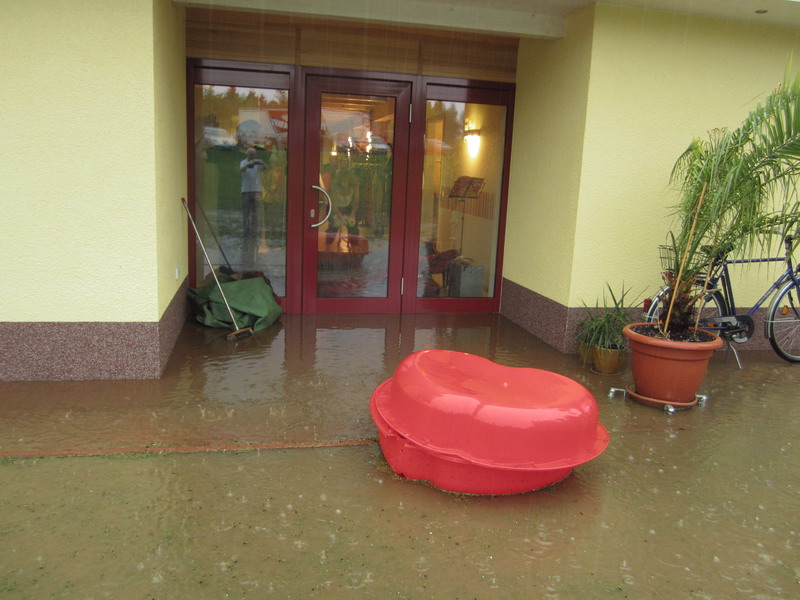 Nur einige Minuten später wäre das Fluten beinahe Realität geworden, denn der Gewitterschauer lies das Wasser bis über die Schwellen der Außentüren steigen. Schnelles beherztes Eingreifen ließ aber Schlimmeres verhindern.