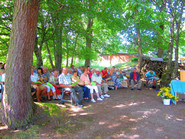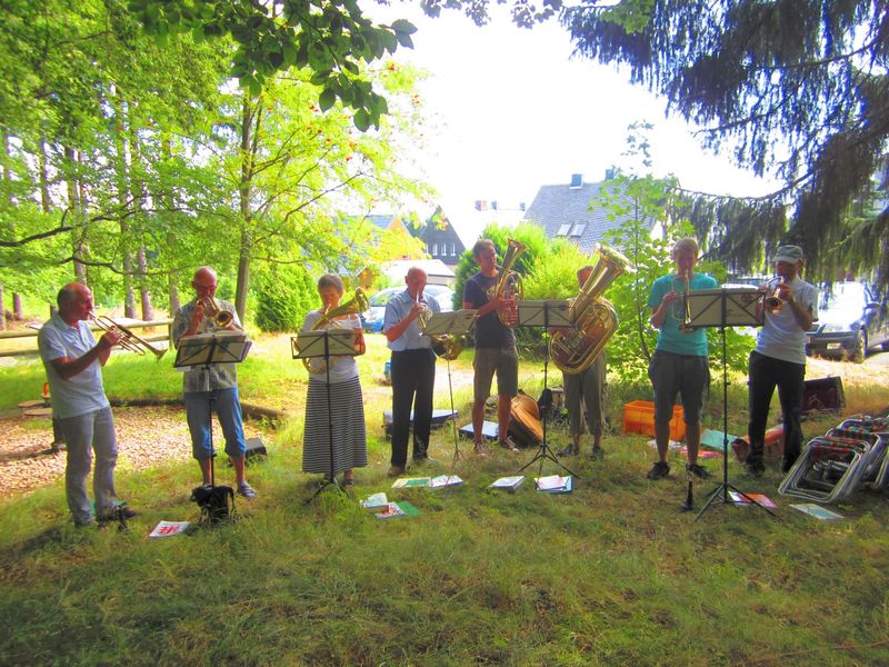 Unterm Blätterdach der großen Buchen im Gelände des Christlichen Erholungshauses war es bei der Sommerhitze gut auszuhalten. Der Posaunenchor begrüßte die Gäste mit Chorälen, Marsch und Swing.