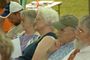 Dann ging es wirklich los. "Namenstag" - so war das Thema des Familientages. So wie Jesus den Öffnet externen Link in neuem FensterZachäus auf dem Baum mit seinem Namen kannte und ihn rief, um bei ihm zu Hause einzukehren, so kennt uns Jesus mit Namen und will auch bei uns einkehren (nachzulesen in der Bibel Lukas 19). Irmela erzählte uns diese Geschichte mit vielen Bildern und der Unterstützung eines "ängstlichen Besuchers auf der Leiter" und natürlich mit Hilfe vieler Kinder. Auf einem großen Bannern wurde zum Schluss der Bibelvers des Tages: "Fürchte dich nicht, denn ich habe dich erlöst; ich habe dich bei deinem Namen gerufen; du bist mein!" entrollt. Natürlich kam das gemeinsame Singen auch nicht zu kurz.